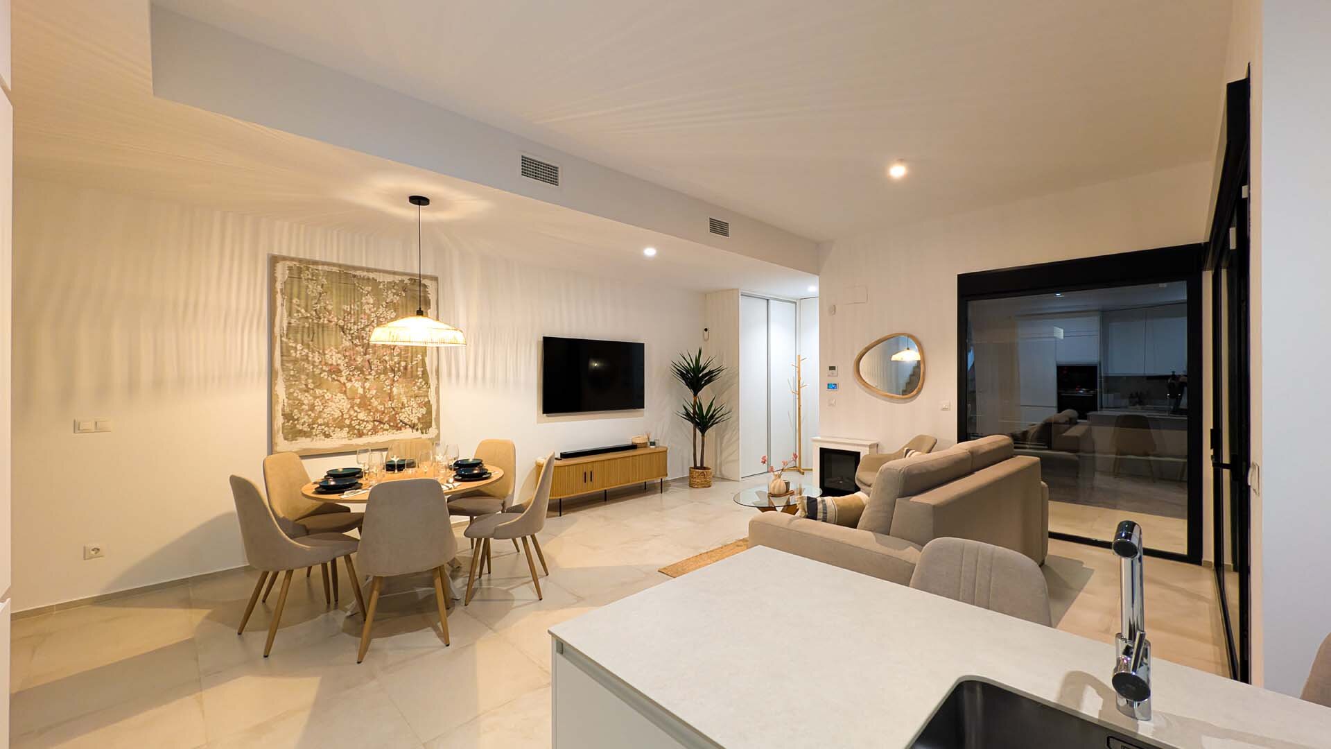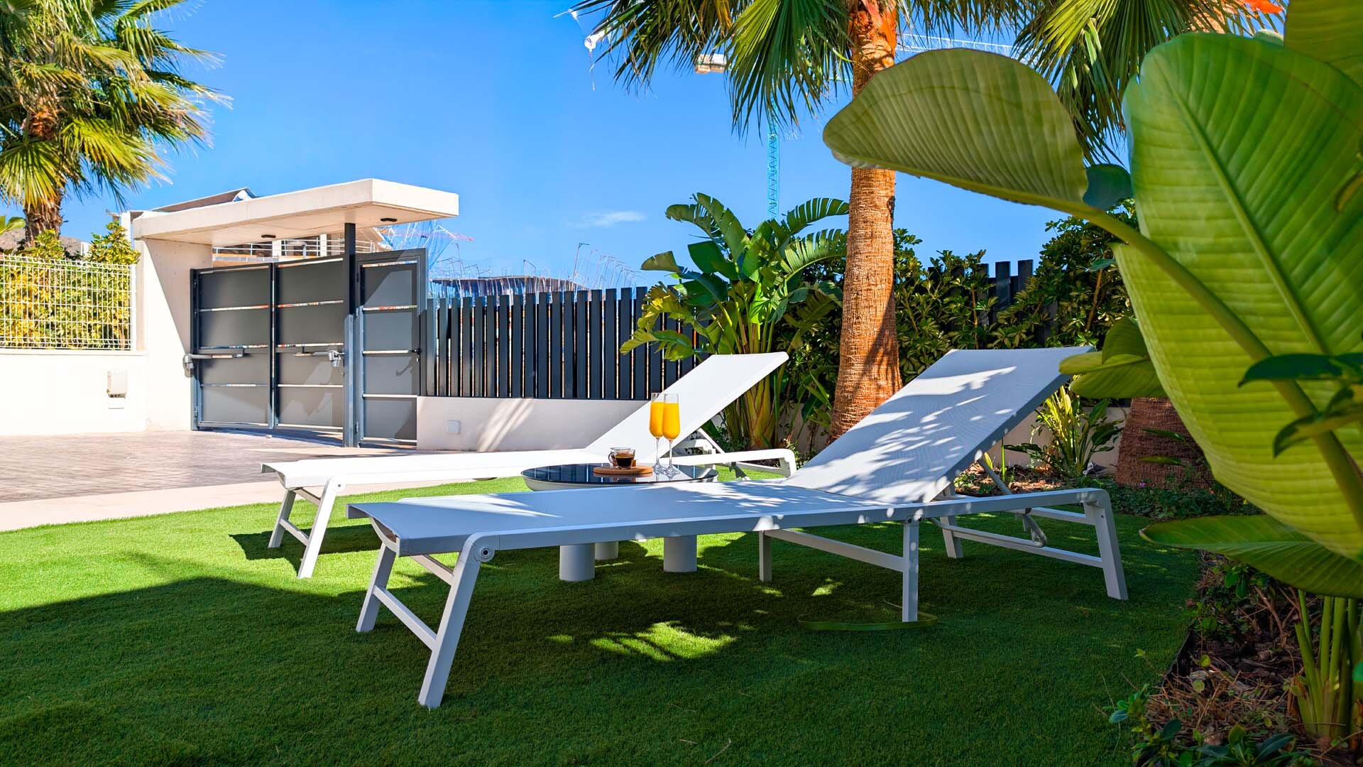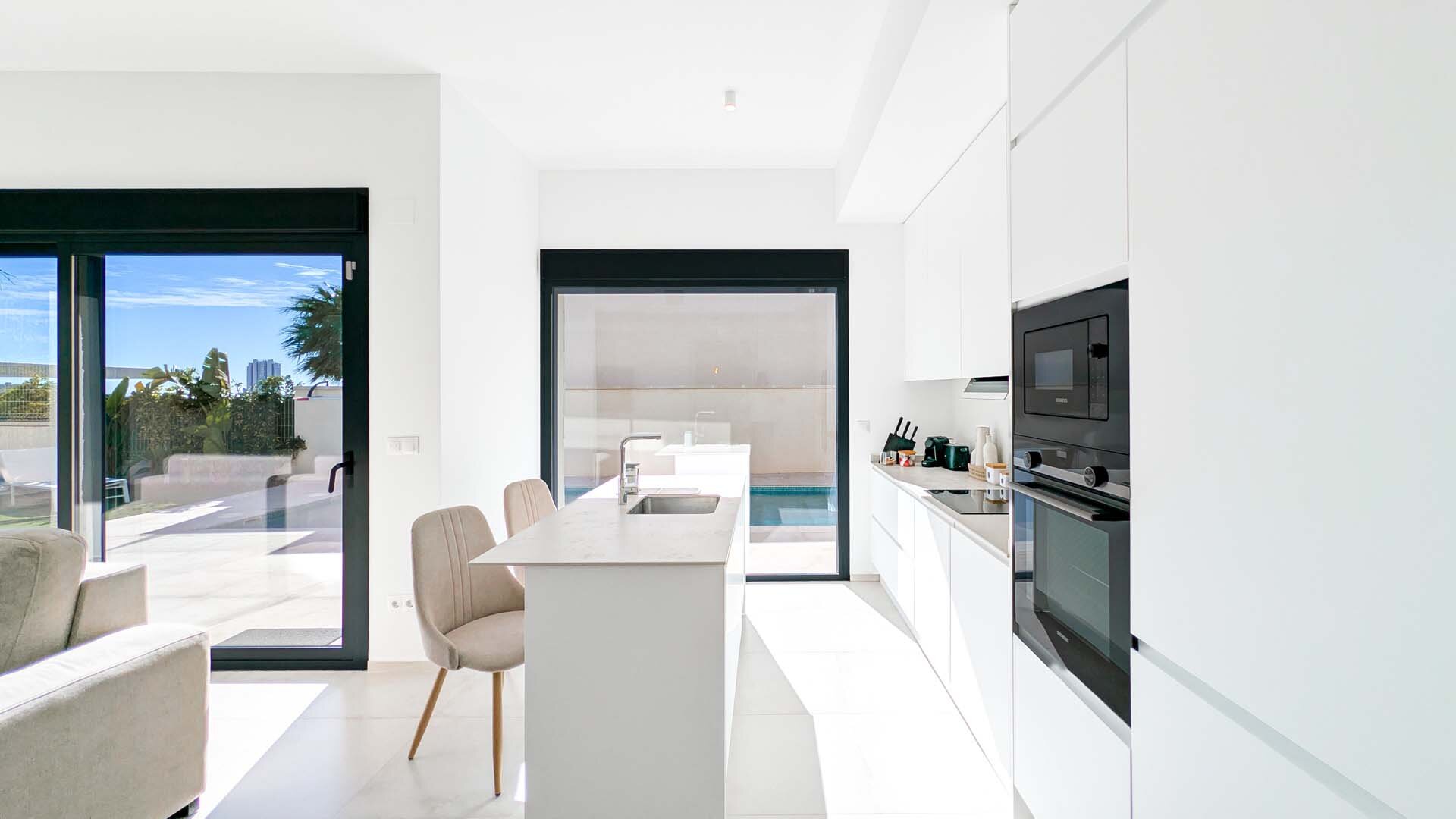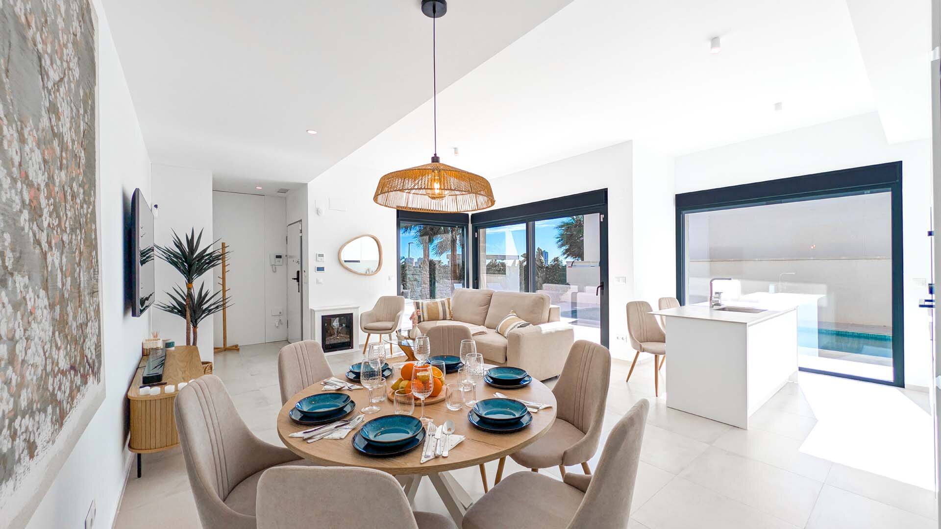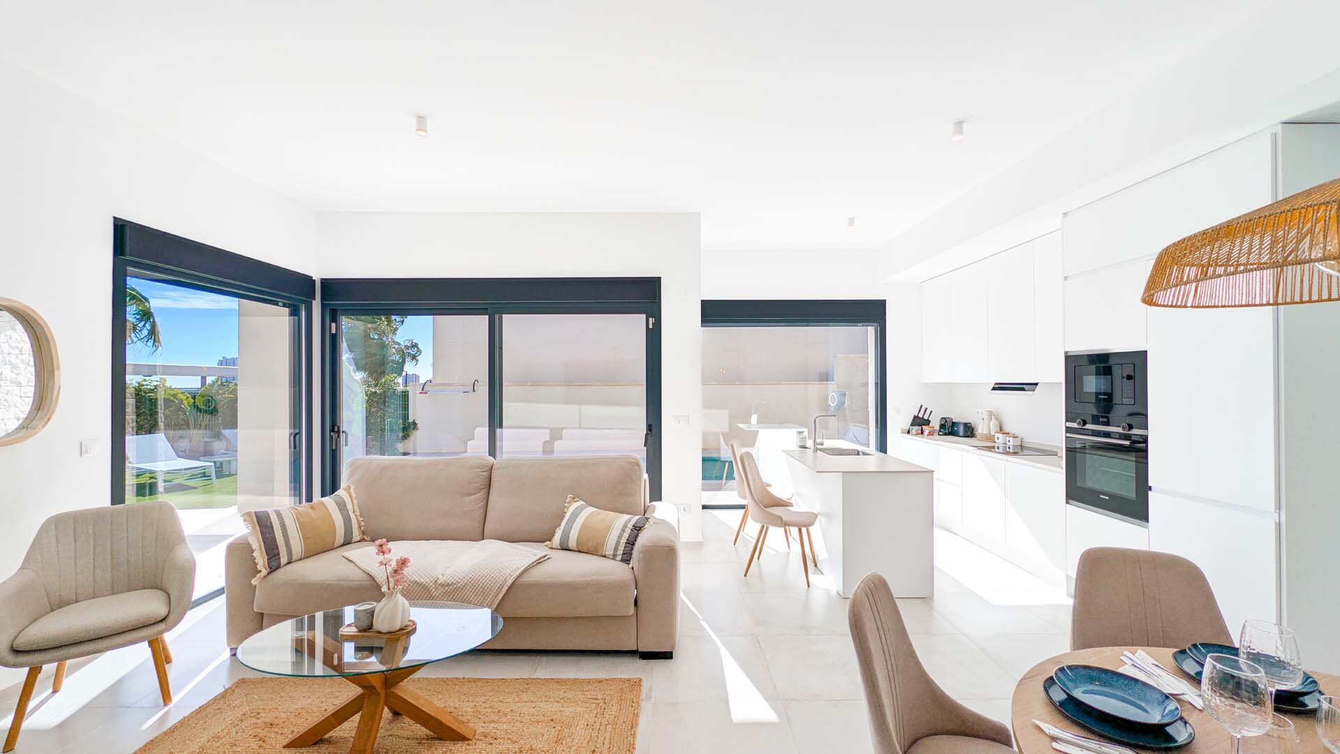Apartment description: This large, spacious villa surrounded by a private garden is a place designed for relaxation and shared moments. In the heart of the garden is a pool available exclusively to guests, where you can start the day with a refreshing swim or end it under the glow of the sunset. The entire space is decorated in an elegant modernist style, combining light, space, and subtle harmony. The spacious living room invites relaxation – a comfortable sofa, TV, and modern kitchen with island create the perfect place for quiet mornings with coffee and long evenings spent together. On the ground floor, there are three bedrooms: two with large, comfortable beds for adults, and a cozy children’s room with two double bunk beds that will delight the youngest guests. Upstairs awaits a sunny solarium, a private light-filled space with comfortable furniture, a large table for shared meals, and a barbecue. It is the perfect place for dinner under the stars, late-night conversations, and memories that last. The apartment is child-friendly and located in a quiet area, with beautiful views of the mountains and Benidorm’s panorama. It is a space where romantic atmosphere meets comfort, and every day passes slowly – just as a perfect holiday should.