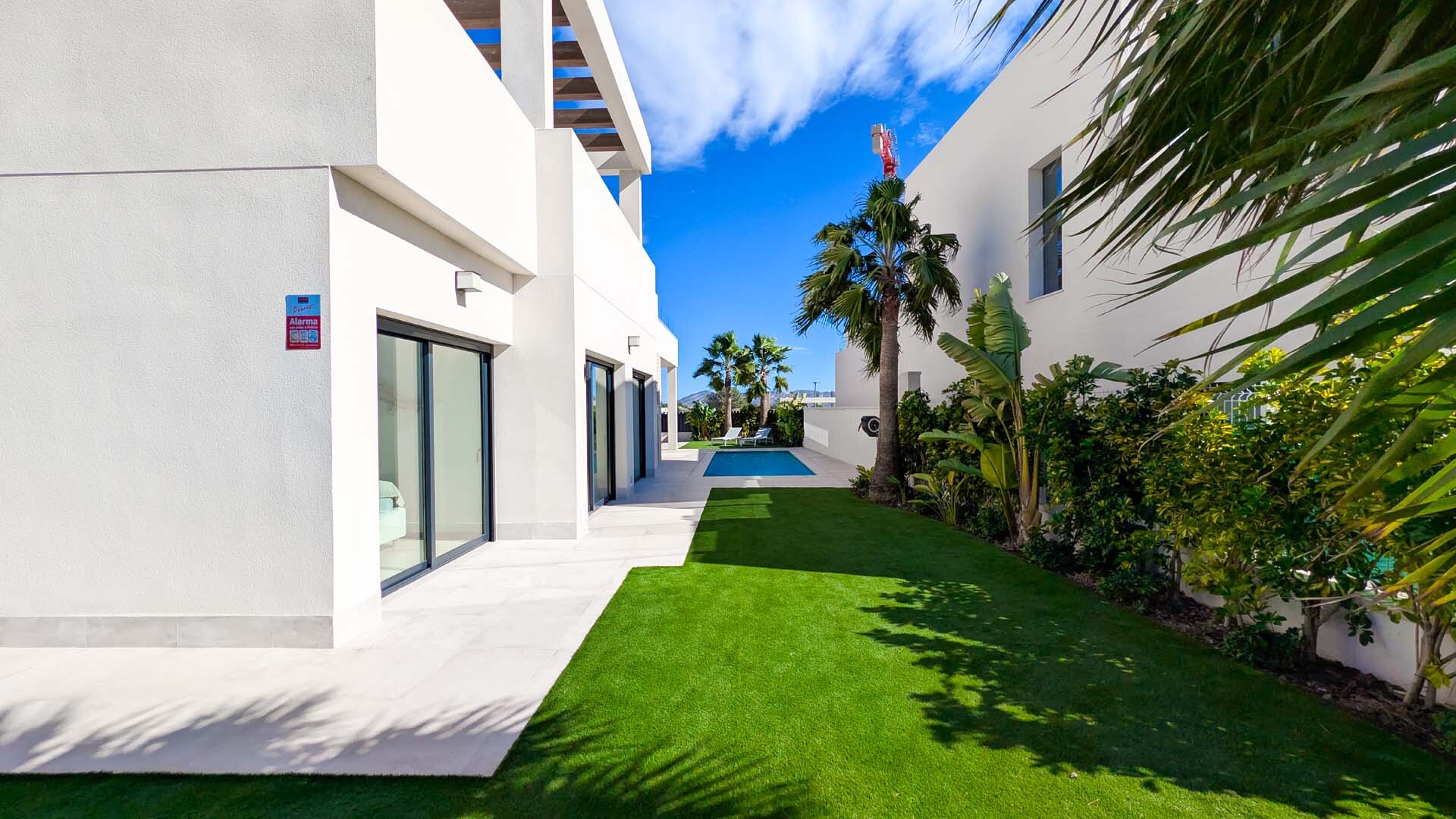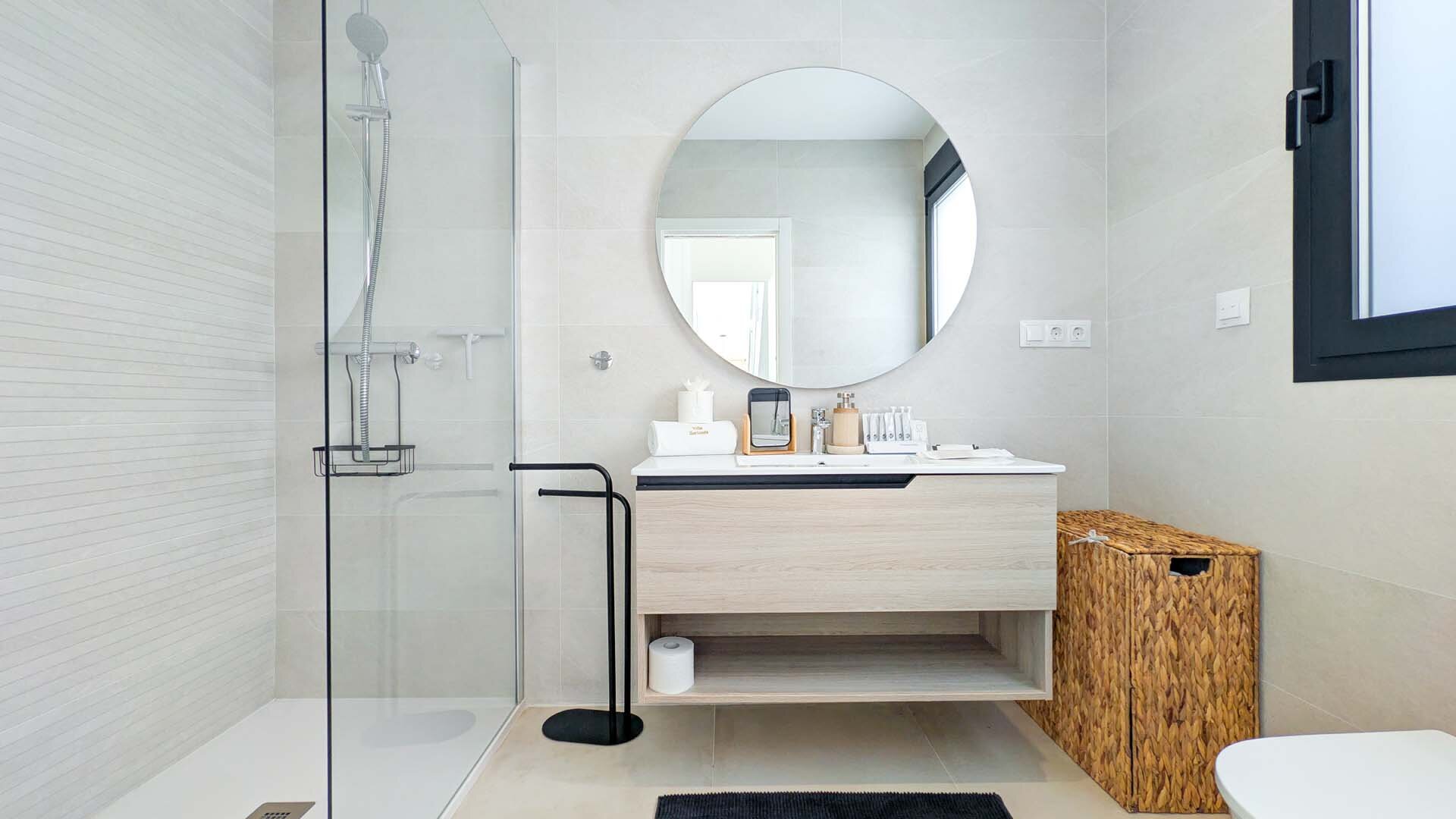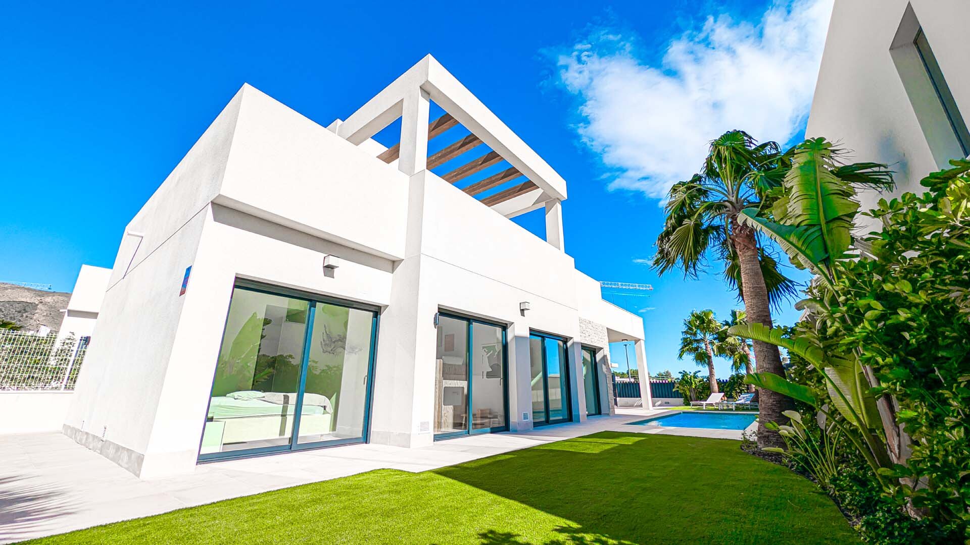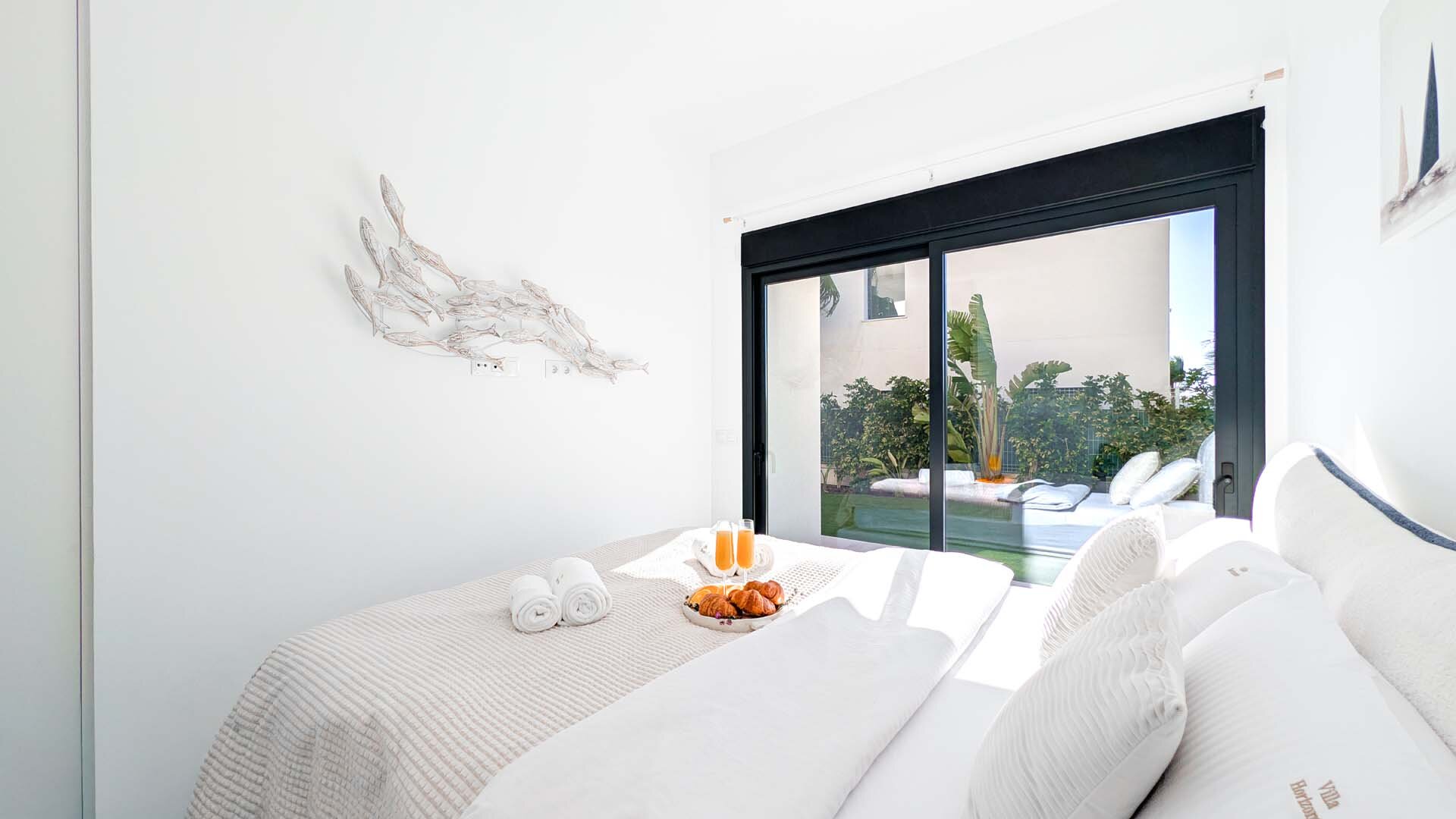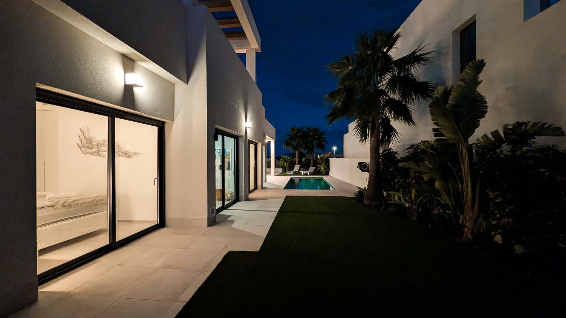 Apartment description: This large, spacious villa surrounded by a private garden is a place designed for relaxation and shared moments. In the heart of the garden is a pool available exclusively to guests, where you can start the day with a refreshing swim or end it under the glow of the sunset. The entire space is decorated in an elegant modernist style, combining light, space, and subtle harmony. The spacious living room invites relaxation – a comfortable sofa, TV, and modern kitchen with island create the perfect place for quiet mornings with coffee and long evenings spent together. On the ground floor, there are three bedrooms: two with large, comfortable beds for adults, and a cozy children’s room with two double bunk beds that will delight the youngest guests. Upstairs awaits a sunny solarium, a private light-filled space with comfortable furniture, a large table for shared meals, and a barbecue. It is the perfect place for dinner under the stars, late-night conversations, and memories that last. The apartment is child-friendly and located in a quiet area, with beautiful views of the mountains and Benidorm’s panorama. It is a space where romantic atmosphere meets comfort, and every day passes slowly – just as a perfect holiday should.